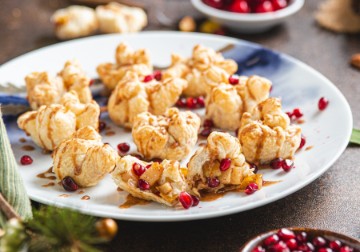 Poached pears and pomegranate seeds wrapped in puff pastry and finished with a cinnamon glaze