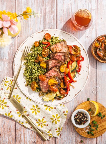 Grilled steak with balsamic stewed tomatoes, lemon pesto farro and roasted spring vegetables