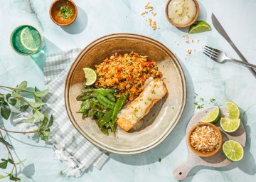 <p>Roasted salmon with a coconut lime sauce, miso fried rice and sesame snap peas</p>
