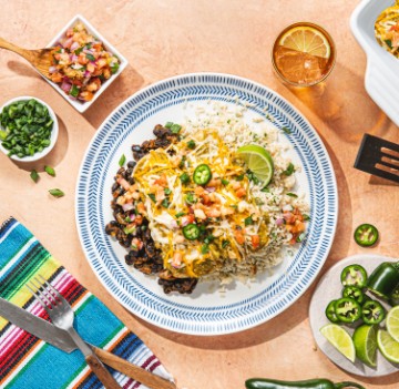 <p>Corn tortillas stuffed with shredded chicken and pico de gallo, topped with green chili verde and vegan cheddar cheese. Served with coriander lime rice and black beans.</p>